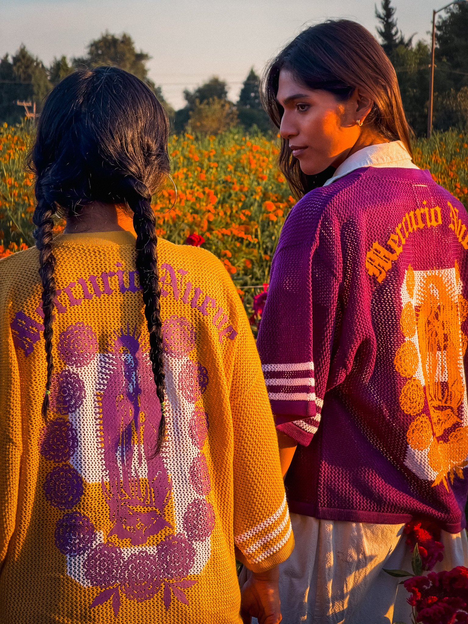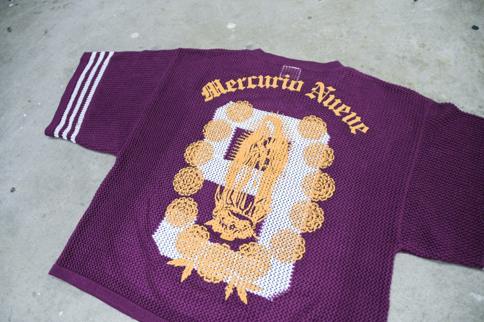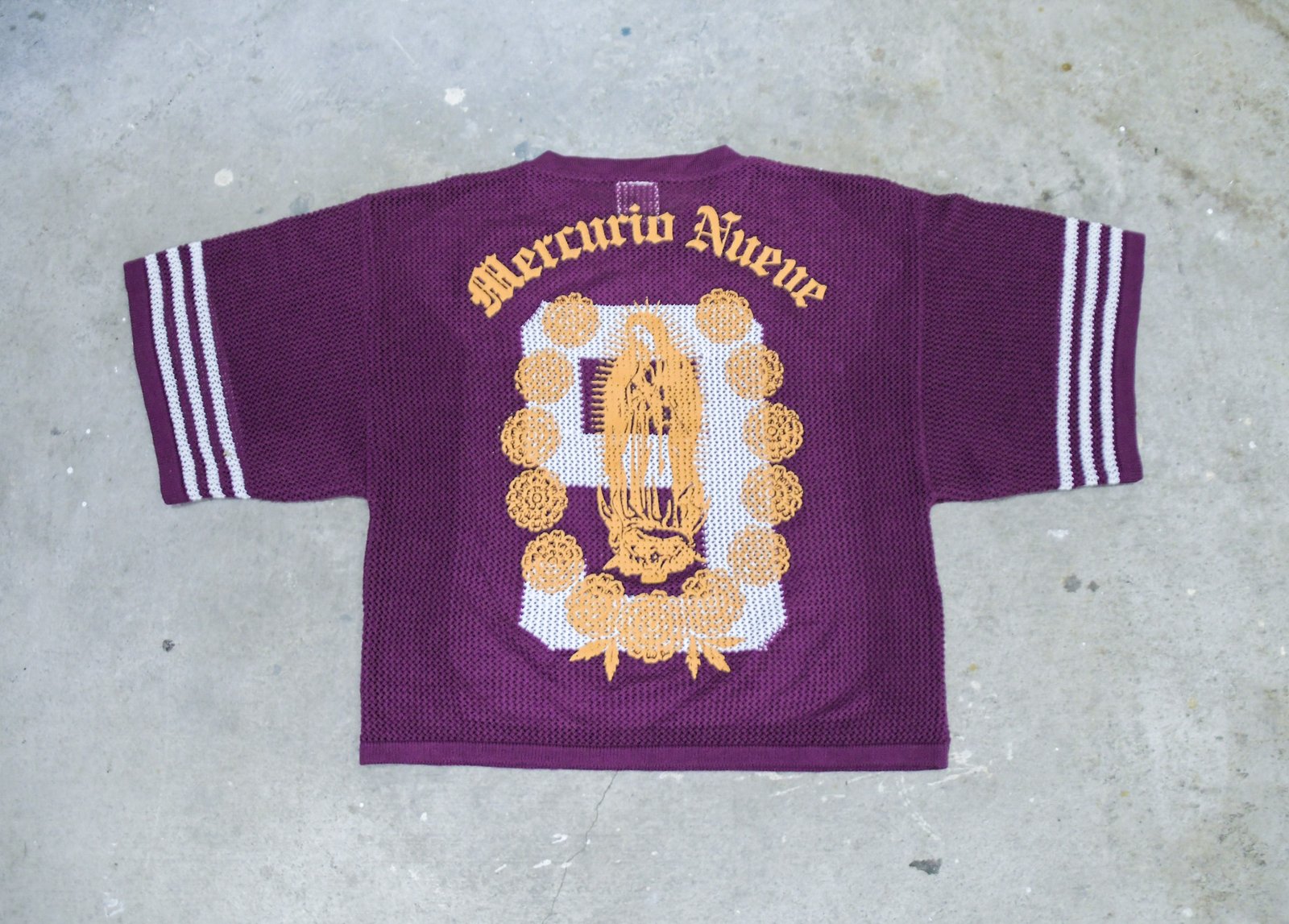 The Purple Knitted Virgen Jersey features a boxy, slightly cropped silhouette crafted in a light open-knit texture that feels breathable and soft against the skin. The deep purple tone conveys strength and elegance, contrasted with marigold detailing that adds warmth and cultural symbolism. A woven depiction of the Virgen de Guadalupe and the phrase “Mercurio Nueve” on the back give it a powerful identity that merges devotion, heritage, and modern street style. A statement piece that embodies balance between bold expression and refined craftsmanship.